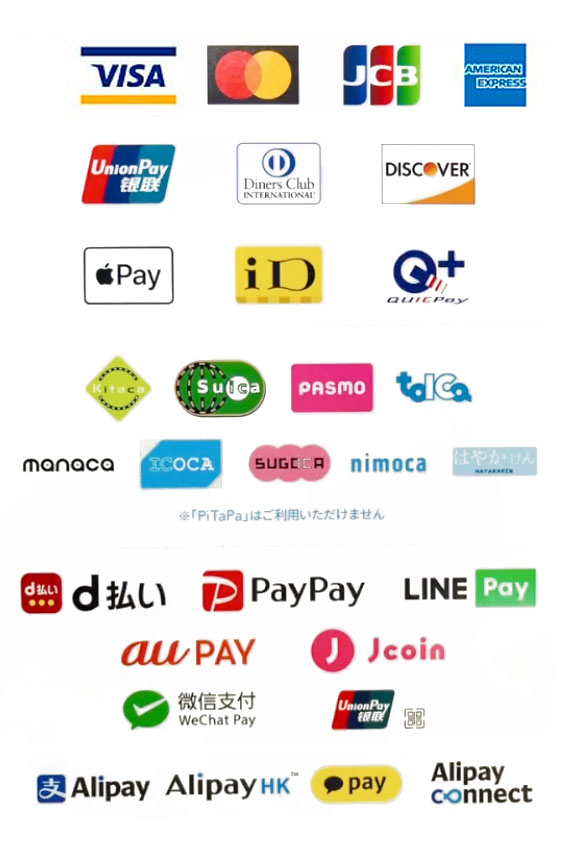 現金、各種電子マネー、QRコード決済、クレジット払い等、以下の主要なキャシュレス決済に対応しています。