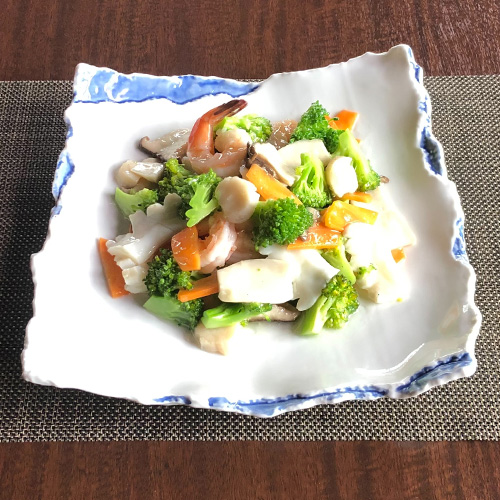 ホタテと海老と三種野菜炒め 小盆1,404円(税込) 中盆2,111円(税込)
